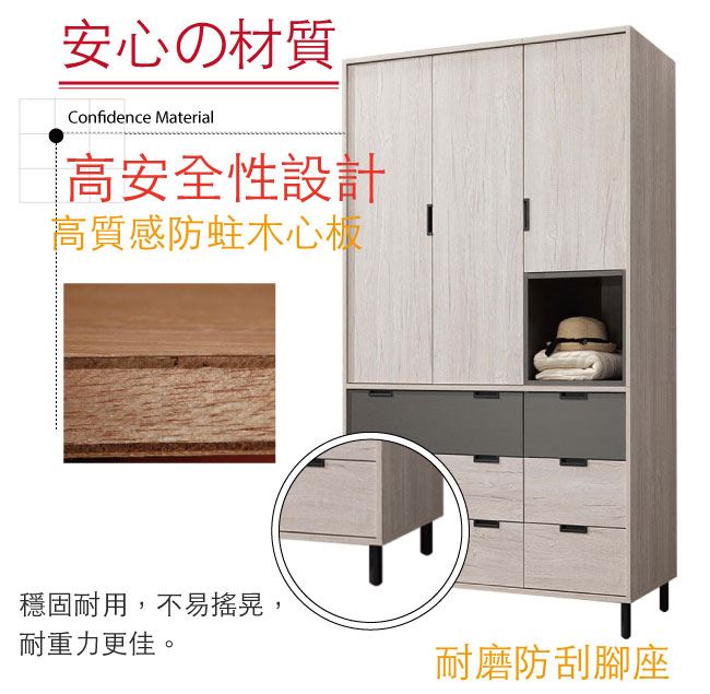 商品 介紹 | 【綠家居】古利德 雙色4尺三門六抽衣櫃/收納櫃 木紋雙色+現代簡約風格+安心材質製造,整體採用防蛀木心板+防夾手緩衝門片五金+防鏽黑漆腳座+五金滑軌結構等安心材質製造,搭配採用開門櫃+吊衣桿+六抽屜+內&外開放式層格等收納空間設計,全由專人配送到家,專業安心服務,替你省下更多時間! 【商品特色】 木紋雙色+現代簡約風格+安心材質製造,使用放心+搭配居家更便利 採用防蛀木心板+防夾手緩衝門片五金+防鏽黑漆腳座+五金滑軌結構等安心材質製造 採用開門櫃+吊衣桿+六抽屜+內&外開放式層格等收納空間設計 此商品不需要DIY組立,此商品為組立後之成品 品質保證、專業設計、貼心服務 全由專人配送到家,專業安心服務,替您省下更多時間 |