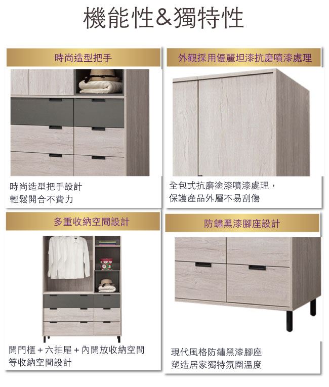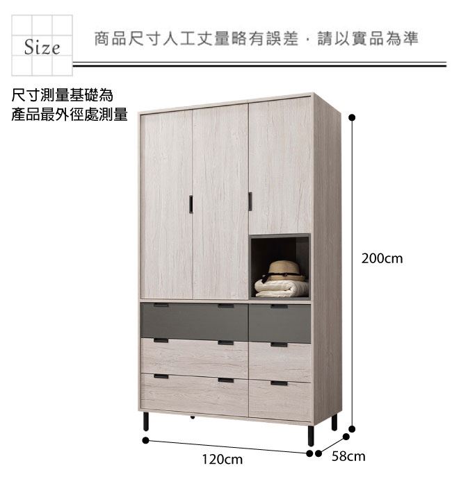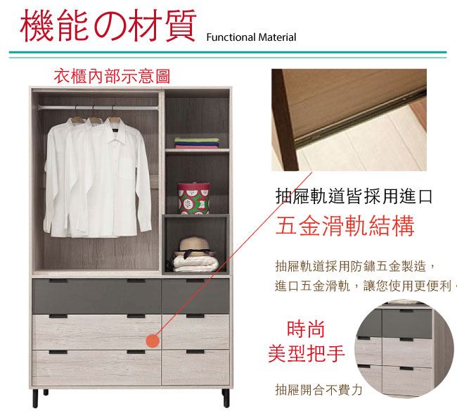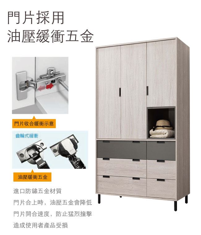 材質 | ◆產品名稱: 【綠家居】古利德 雙色4尺三門六抽衣櫃/收納櫃 尺寸:(寬)120x(深)58x(高)200/公分 ◆材質: 材質:防蛀木心板+防夾手緩衝門片五金+防鏽黑漆腳座+五金滑軌結構 噴漆:外層採用防潮耐磨&亮面噴漆處理