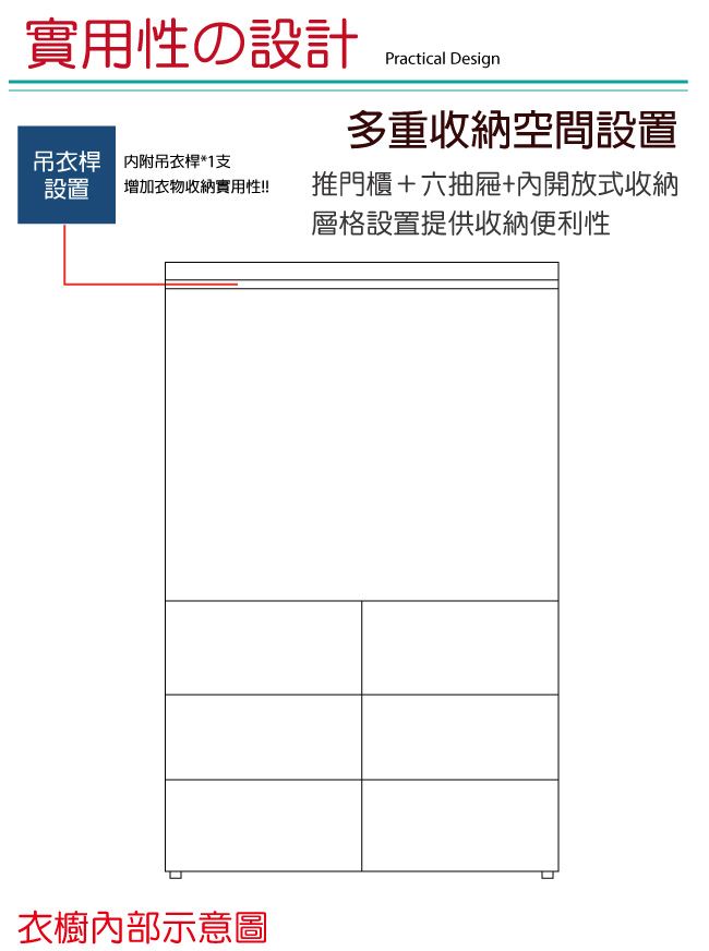 材質 | ◆產品名稱: 【綠家居】約拿 時尚4尺推門六抽衣櫃/收納櫃(四色可選) 尺寸:(寬)120x(深)57x(高)204/公分 ◆材質: 材質:防蛀木心板+五金滑軌結構+防潮耐磨腳座