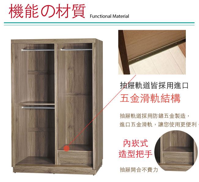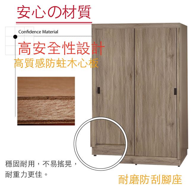 材質 | ◆產品名稱: 【綠家居】加比 時尚4.9尺推門衣櫃/收納櫃 尺寸:(寬)145.5x(深)59x(高)194/公分 ◆材質: 材質:防蛀木心板+五金滑軌結構+防潮耐磨腳座