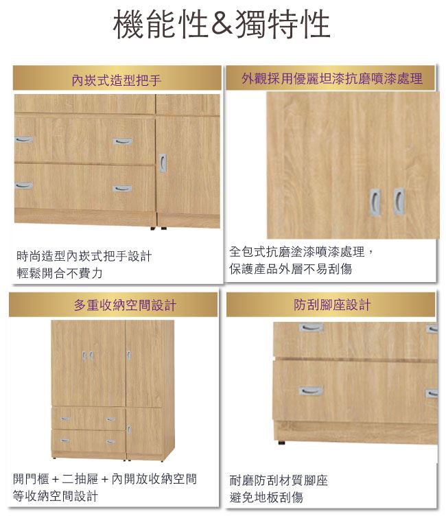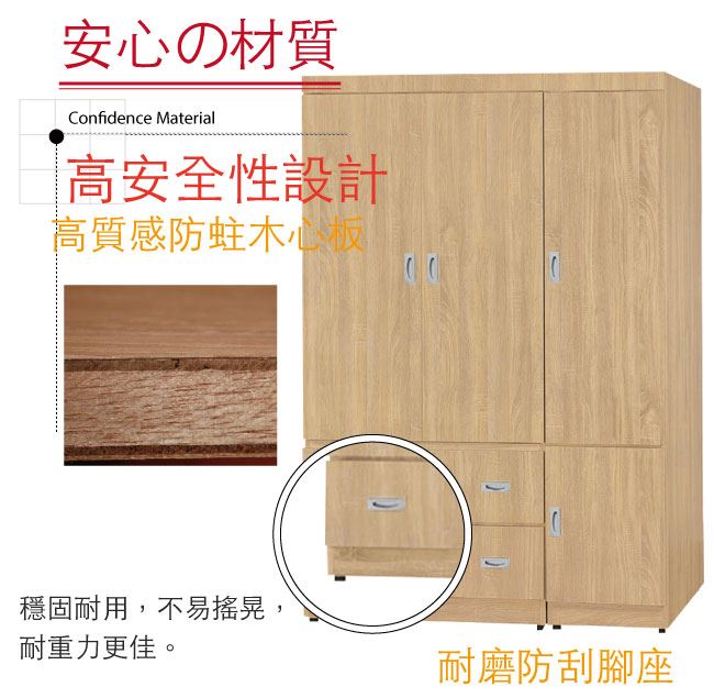 商品 介紹 | 【綠家居】比勒 時尚4尺四門二抽衣櫃/收納櫃(附穿衣鏡面) 橡木紋色+現代簡約風格+安心材質製造,整體採用防蛀木心板+五金滑軌結構+防潮耐磨腳座等安心材質製造,搭配採用開門櫃+吊衣桿+二抽屜+穿衣鏡面+內開放式收納層格等收納空間設計,全由專人配送到家,專業安心服務,替你省下更多時間! 【商品特色】 橡木紋色+現代簡約風格+安心材質製造,使用放心+搭配居家更便利 採用防蛀木心板+五金滑軌結構+防潮耐磨腳座等安心材質製造 採用開門櫃+吊衣桿+二抽屜+穿衣鏡面+內開放式收納層格等收納空間設計 此商品不需要DIY組立,此商品為組立後之成品 品質保證、專業設計、貼心服務 全由專人配送到家,專業安心服務,替您省下更多時間 |