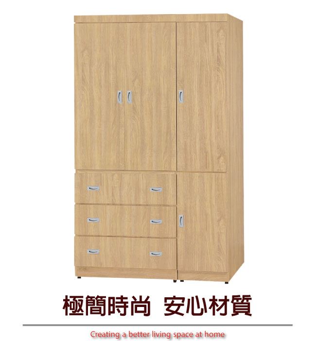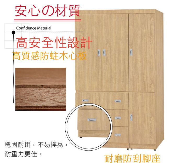 商品 介紹 | 【綠家居】比勒 時尚4尺四門三抽衣櫃/收納櫃(附穿衣鏡面) 橡木紋色+現代簡約風格+安心材質製造,整體採用防蛀木心板+五金滑軌結構+防潮耐磨腳座等安心材質製造,搭配採用開門櫃+吊衣桿+三抽屜+穿衣鏡面+內開放式收納層格等收納空間設計,全由專人配送到家,專業安心服務,替你省下更多時間! 【商品特色】 橡木紋色+現代簡約風格+安心材質製造,使用放心+搭配居家更便利 採用防蛀木心板+五金滑軌結構+防潮耐磨腳座等安心材質製造 採用開門櫃+吊衣桿+三抽屜+穿衣鏡面+內開放式收納層格等收納空間設計 此商品不需要DIY組立,此商品為組立後之成品 品質保證、專業設計、貼心服務 全由專人配送到家,專業安心服務,替您省下更多時間 |