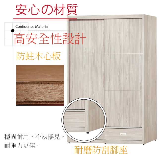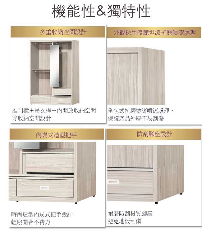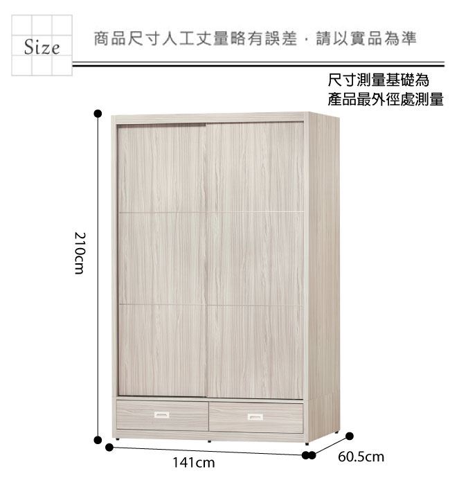 材質 | ◆產品名稱: 【綠家居】福瑞 梣木紋4.7尺推門二抽高衣櫃(含穿衣鏡面) 產品尺寸: 尺寸:(寬)141x(深)60.5x(高)210/公分 ◆材質: 材質:防蛀木心板+防潮耐磨腳座 材質:五金滑軌結構+強化玻璃鏡面 塗漆:優利坦全包式耐磨噴漆處理