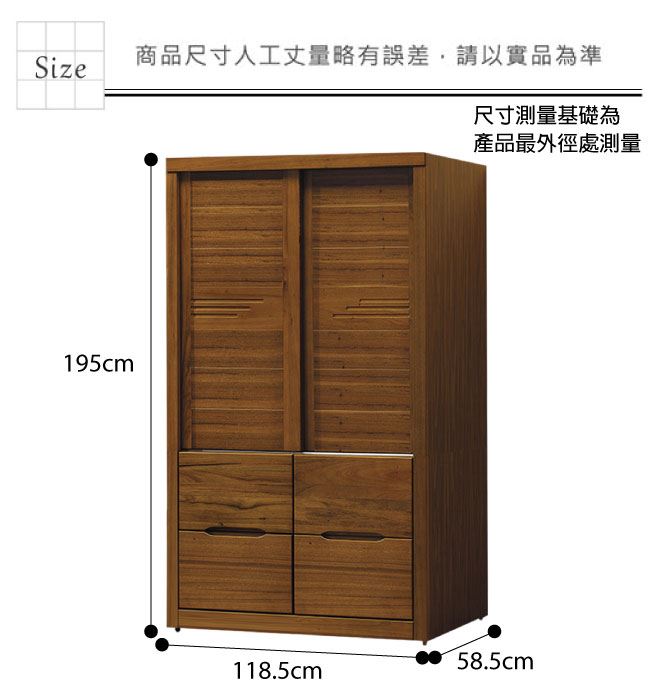 材質 | ◆產品名稱: 【綠家居】柏林 時尚4尺實木推門四抽衣櫃/收納櫃 尺寸:(寬)118.5x(深)58.5x(高)195/公分 ◆材質: 材質:樟木實木+防蛀木心板+五金滑軌結構+防刮耐磨腳座 外層採用防潮耐磨噴漆處理