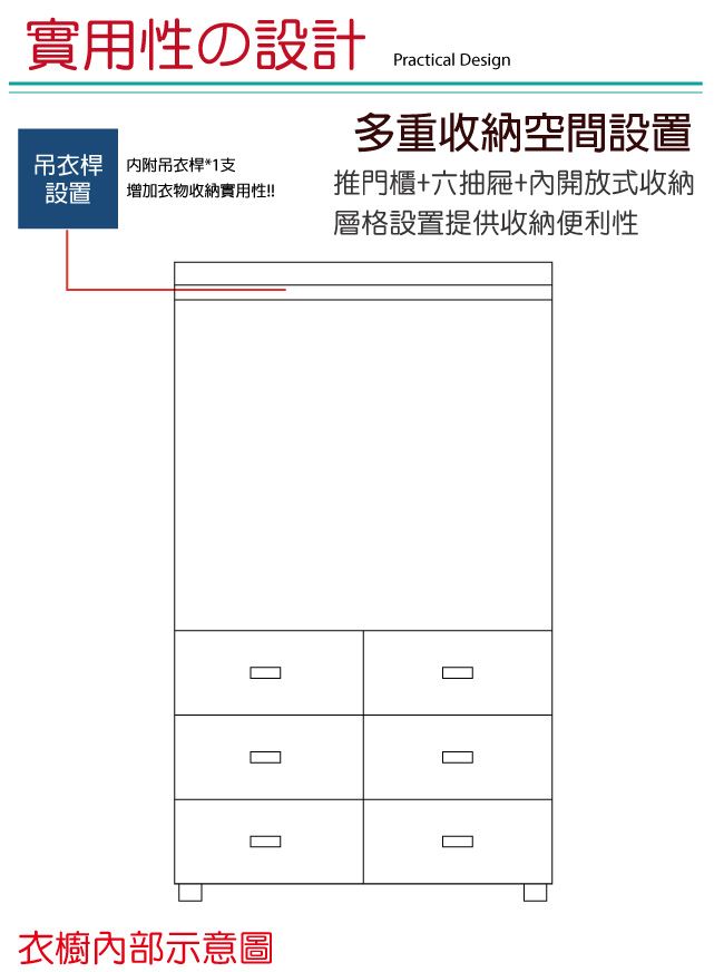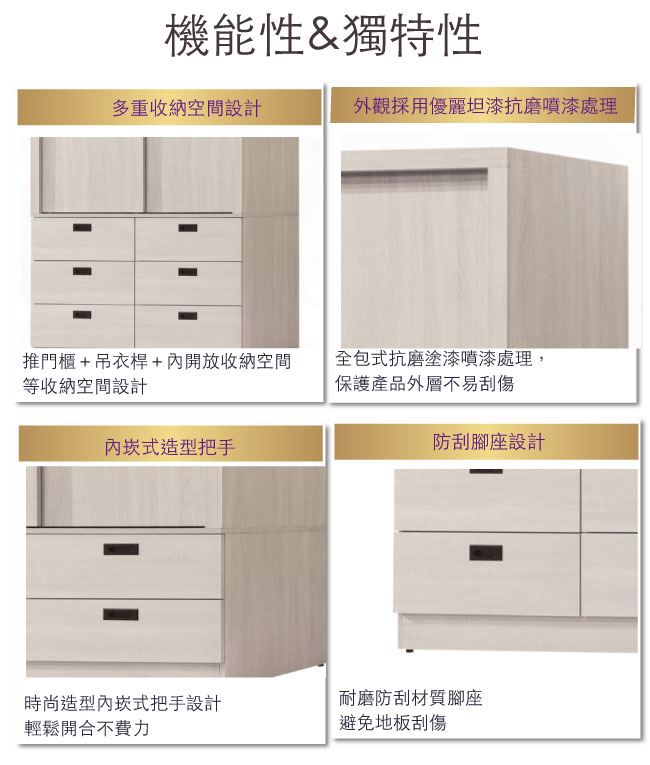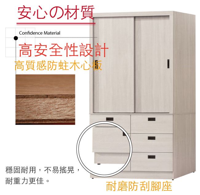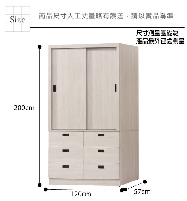 材質 | ◆產品名稱: 【綠家居】提米 時尚4尺推門六抽衣櫃/收納櫃 尺寸:(寬)120x(深)57x(高)200/公分 ◆材質: 材質:防蛀木心板+防潮耐磨腳座+五金滑軌結構 外層採用全包式防潮耐磨噴漆處理