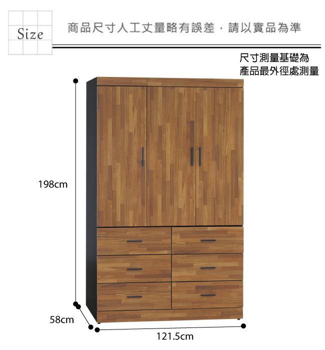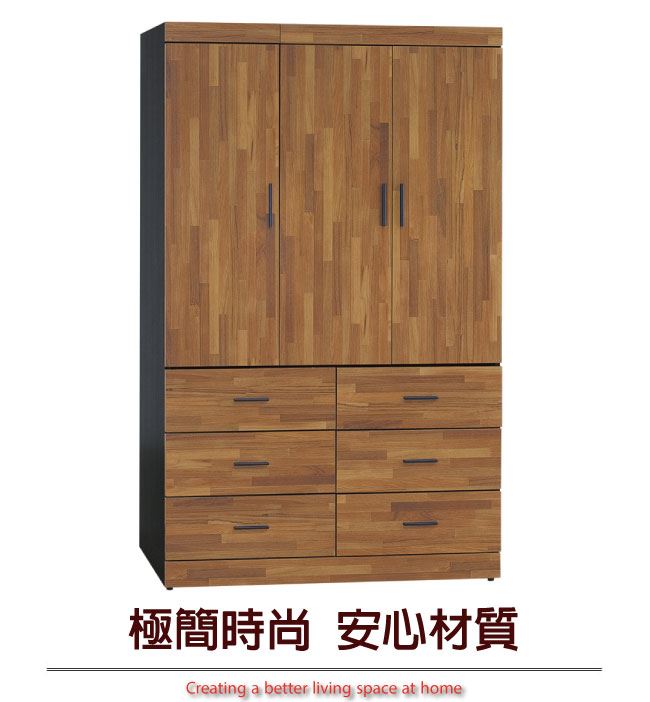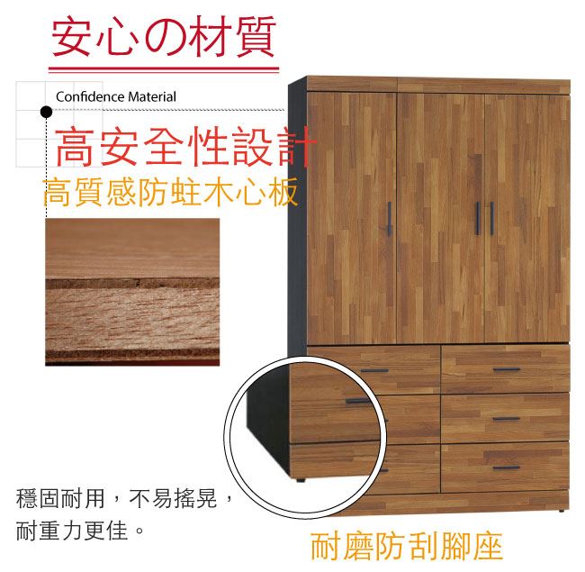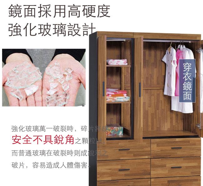 材質 | ◆產品名稱: 【綠家居】麥菲凱 時尚4.1尺三門六抽衣櫃/收納櫃(附穿衣鏡面) 尺寸:(寬)121.5x(深)58x(高)198公分 ◆材質: 材質:防蛀木心板+防潮耐磨腳座+五金滑軌結構+防夾手緩衝門片五金 外層採用全包式防潮耐磨噴漆處理
