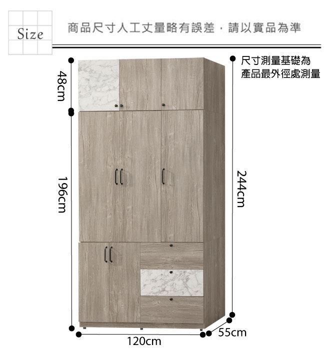 尺寸:(寬)120x(深)55(高)244/公分 ◆材質: 材質:防蛀木心板+防潮耐磨腳座+防夾手緩衝門片五金+五金滑軌結構 噴漆:防潮耐磨噴漆處理