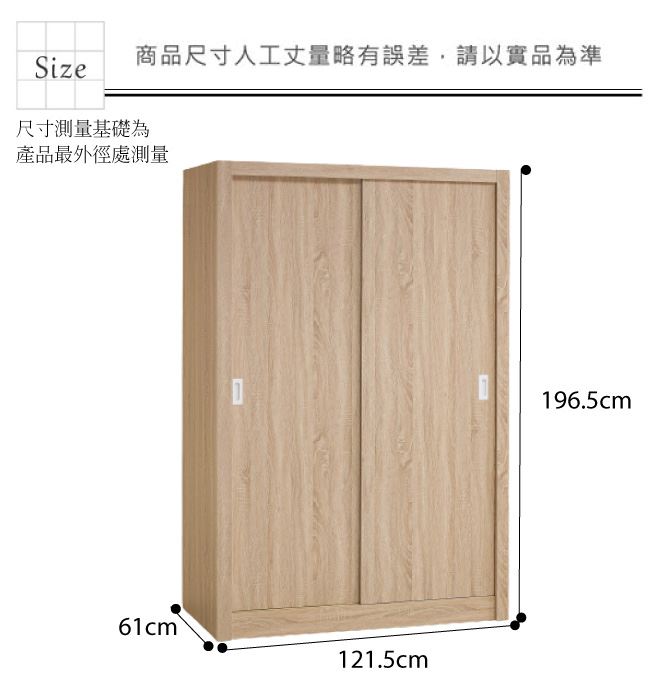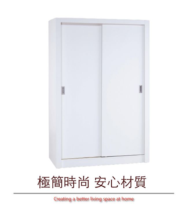 產品名稱:【綠家居】艾瑟斯 時尚4.1尺推門衣櫃(二色可選) 產品尺寸: 尺寸:(寬)121.5x(深)61x(高)196.5/公分 ◆材質: 材質:防蛀木心板+防潮耐磨腳座 材質:五金滑軌結構 塗漆:優利坦全包式耐磨&亮面噴漆處理