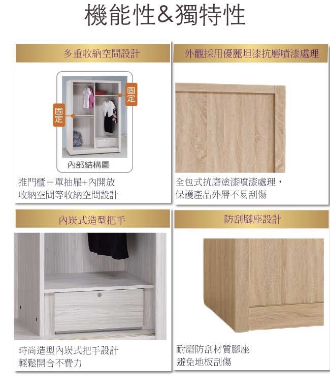 商 品 介 紹 | 【綠家居】艾瑟斯 時尚4.1尺推門衣櫃(二色可選) 二色可選+現代簡約風格+安心材質製造,整體採用防蛀木心板+防潮耐磨腳座+五金滑軌結構等安心材質製造,外層採用優利坦全包式耐磨&亮面漆處理搭配推門櫃+吊衣桿+單抽屜+內開放式收納等收納空間設計,全由專人配送到家,專業安心服務,替你省下更多時間! 【商品特色】 二色可選+現代簡約風格+安心材質製造,使用放心+搭配居家更便利 採用防蛀木心板+防潮耐磨腳座+五金滑軌結構安心材質製造 推門櫃+吊衣桿+單抽屜+內開放式收納等收納空間設計 此商品不需要DIY組立,此商品為組立後之成品 全由專人配送到家,專業安心服務,替您省下更多時間 |