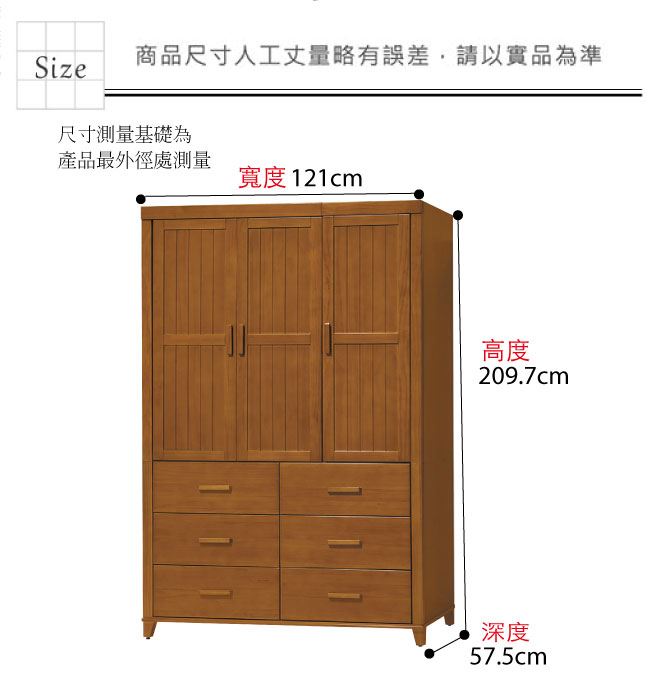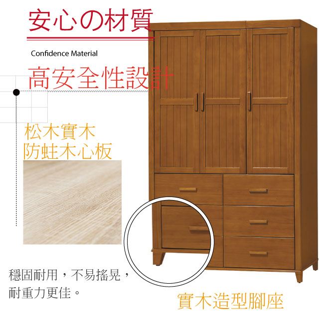 材質 | ◆產品名稱:【綠家居】梅利實木4尺三門六抽衣櫃 尺寸:(寬)121x(深)57.5(高)209.7/公分 ◆材質: 材質:松木實木+防蛀木心板+防刮耐磨腳座+五金滑軌結構 噴漆:防潮耐磨噴漆處理