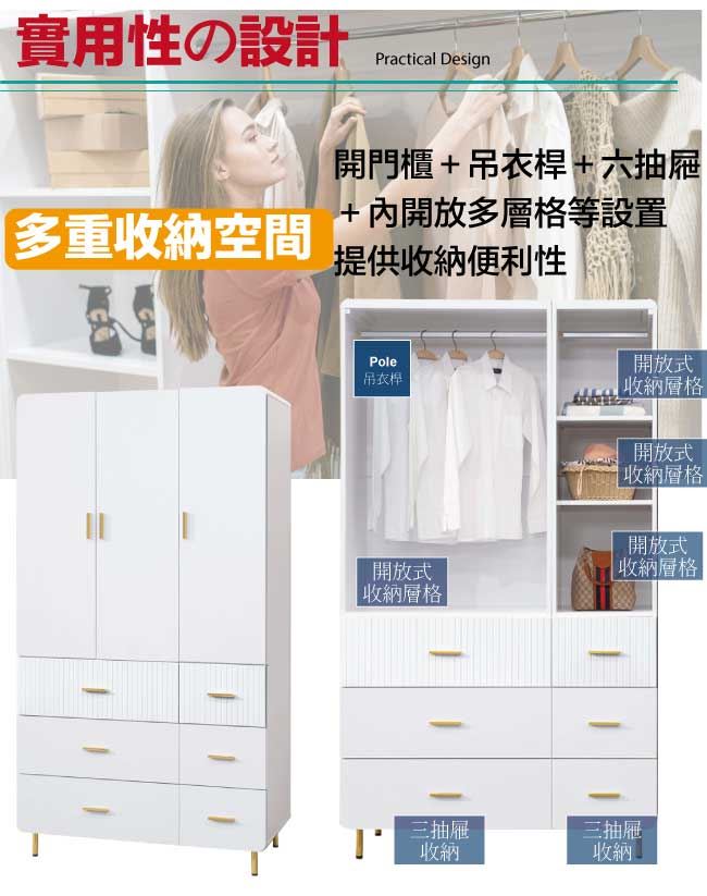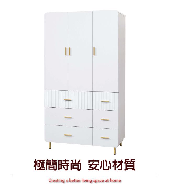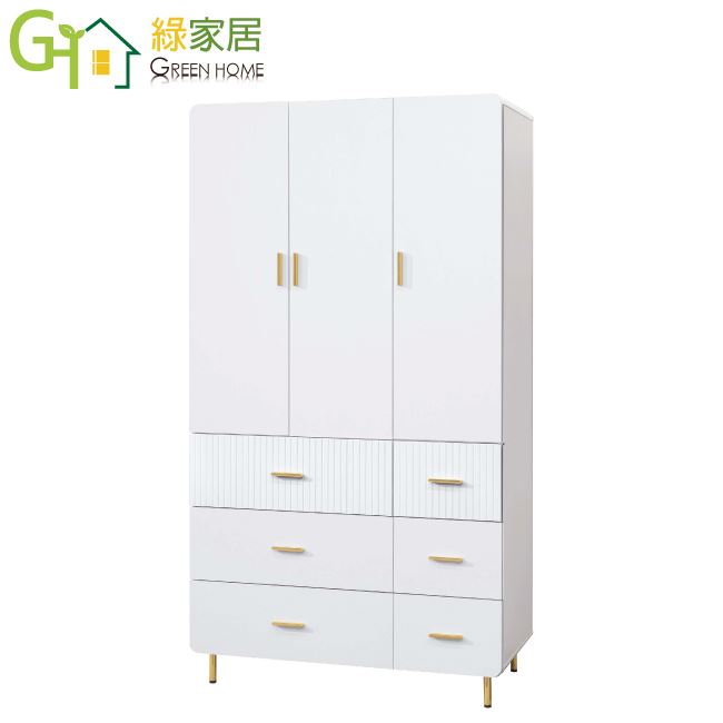 【綠家居】培亞輕奢白4尺三門六抽衣櫃