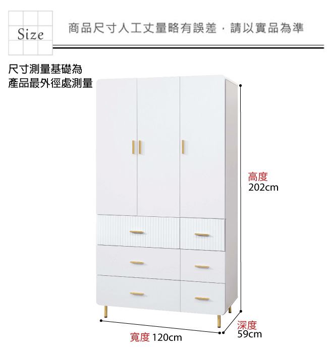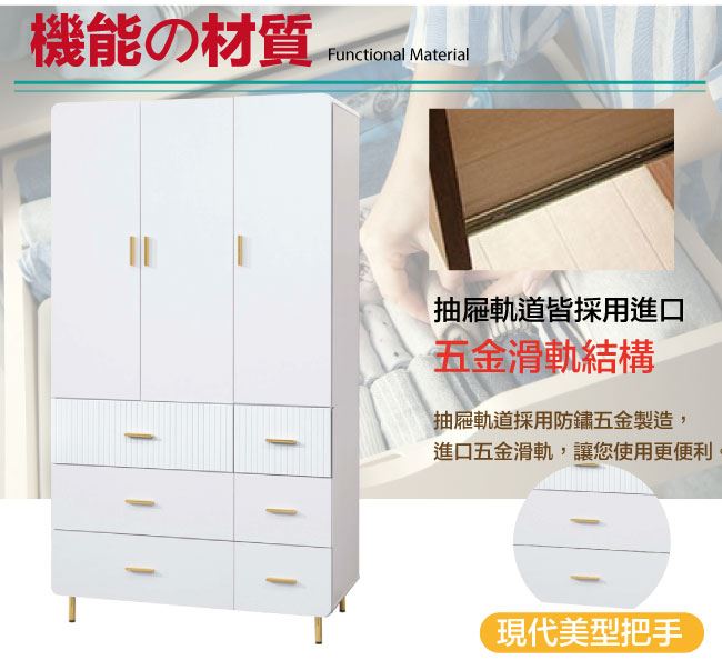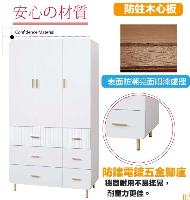 材質 | ◆產品名稱:【綠家居】培亞輕奢白4尺三門六抽衣櫃 尺寸:(寬)120x(深)59(高)202/公分 ◆材質: 材質:防潮MDF板材+防鏽金漆腳座+五金滑軌結構+防夾手緩衝門片五金 噴漆:防潮亮面噴漆處理