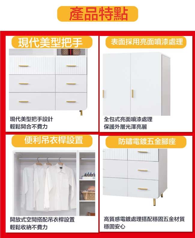 商 品 介 紹 | 【綠家居】培亞輕奢白4尺三門六抽衣櫃 輕奢白色系+現代簡約風格+安心材質製造,整體採用防潮MDF板材+防鏽金漆腳座+五金滑軌結構+防夾手緩衝門片五金等安心材質製造,產品外層採用防潮亮面噴漆處理搭配採用開門櫃+吊衣桿+六抽屜+內開放式收納等收納空間設計,全由專人配送到家,專業安心服務,替你省下更多時間! 【商品特色】 輕奢白色系+現代簡約風格+安心材質製造,使用放心+搭配居家更便利 採用防潮MDF板材+防鏽金漆腳座+五金滑軌結構+防夾手緩衝門片五金等安心材質製造 產品外層採用防潮亮面噴漆處理 搭配採用開門櫃+吊衣桿+六抽屜+內開放式收納等收納空間設計 此商品不需要DIY組立,此商品為組立後之成品 品質保證、專業設計、貼心服務 全由專人配送到家,專業安心服務,替您省下更多時間 |