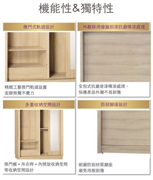 材質 | ◆產品名稱:【綠家居】米安4尺推門衣櫃(二色可選+內含穿衣鏡面) 尺寸:(寬)120x(深)59.5(高)203/公分 ◆材質: 材質:防蛀木心板+防刮耐磨腳座+五金滑軌結構+強化玻璃鏡面 噴漆:防潮耐磨噴漆處理