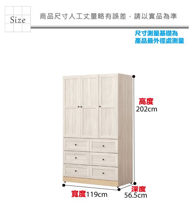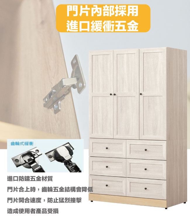 材質 | ◆產品名稱:【綠家居】范辛頓4尺三門六抽衣櫃/收納櫃 尺寸:(寬)119(深)56.5(高)202公分 ◆材質: 材質:防蛀木心板+防潮耐磨腳座+防夾手緩衝門片五金+五金滑軌結構 噴漆:防潮耐磨噴漆處理