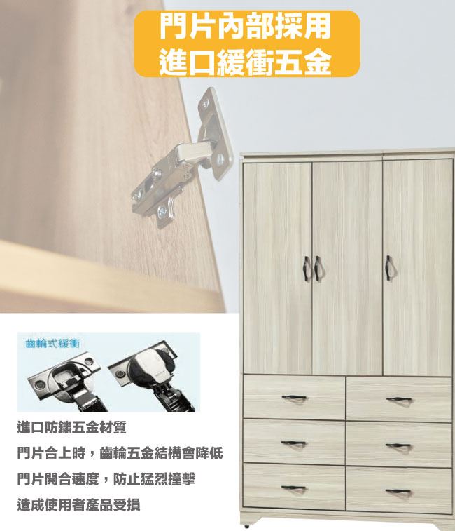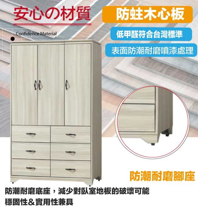 材質 | ◆產品名稱:【綠家居】邁森4尺三門六抽衣櫃(內含穿衣鏡面) 尺寸:(寬)119.3x(深)55(高)202公分 ◆材質: 材質:防蛀木心板+防潮耐磨底座+防夾手緩衝門片五金+五金滑軌結構 噴漆:防潮耐磨噴漆處理