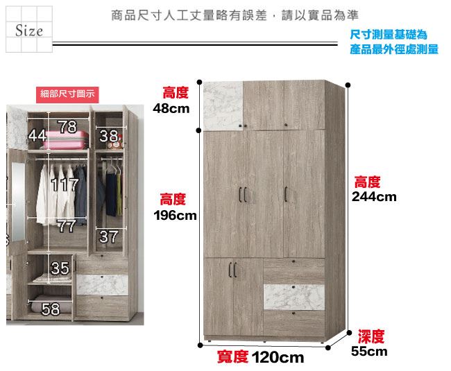 商 品 介 紹 | 【綠家居】比博4尺八門三抽加高衣櫃組合(內含穿衣鏡面) 灰橡木紋雙色系+現代簡約風格+安心材質製造,使用放心+搭配居家更便利,整體採用防蛀木心板+防潮耐磨腳座+五金滑軌結構+強化玻璃鏡面+防夾手緩衝門片五金等材質搭配外層採用優莉坦耐磨全包式噴漆處理 ,採用開門櫃+吊衣桿+三抽屜+內含穿衣鏡面+內開放層格等收納空間設計,全由專人配送到家,專業安心服務,替你省下更多時間! 【商品特色】 灰橡木紋雙色系+現代簡約風格+安心材質製造,使用放心+搭配居家更便利 防蛀木心板+防潮耐磨腳座+五金滑軌結構+強化玻璃鏡面+防夾手緩衝門片五金等材質 採用開門櫃+吊衣桿+三抽屜+內含穿衣鏡面+開放層格等收納空間設計 此商品不需要DIY組立,此商品為組立後之成品 品質保證、專業設計、貼心服務 全由專人配送到家,專業安心服務,替您省下更多時間 |