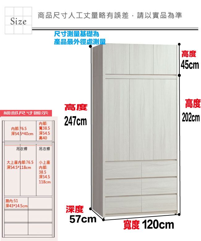 材質 | ◆產品名稱:【綠家居】羅利安4尺開門加高六抽衣櫃組合 尺寸:(寬)120x(深)57x(高)247/公分 ◆材質: 材質:防蛀木心板+防潮耐磨腳座+防夾手緩衝門片五金+五金滑軌結構 噴漆:防潮耐磨噴漆處理 |