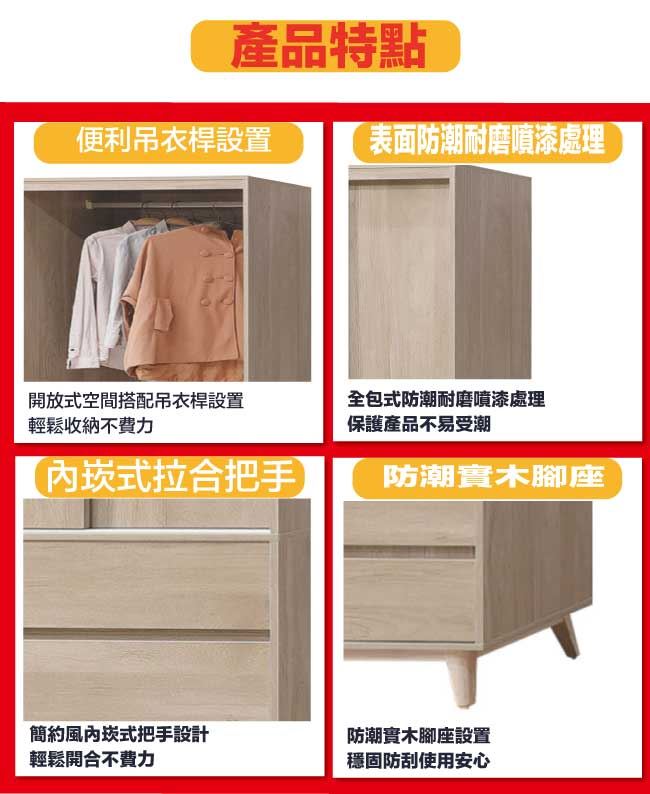 商 品 介 紹 | 【綠家居】奧納夫4尺推門六抽衣櫃 橡木紋色系+現代簡約風格+安心材質製造,使用放心+搭配居家更便利,整體採用防蛀木心板+實木防刮腳座+五金滑軌結構等安心材質製造搭配外層採用優莉坦耐磨全包式噴漆處理 ,採用推門櫃+吊衣桿+六抽屜+內開放層格等收納空間設計,全由專人配送到家,專業安心服務,替你省下更多時間! 【商品特色】 橡木紋色系+現代簡約風格+安心材質製造,使用放心+搭配居家更便利 防蛀木心板+實木防刮腳座+五金滑軌結構等安心材質製造 採用推門櫃+吊衣桿+六抽屜+內開放層格等收納空間設計 此商品不需要DIY組立,此商品為組立後之成品 品質保證、專業設計、貼心服務 全由專人配送到家,專業安心服務,替您省下更多時間