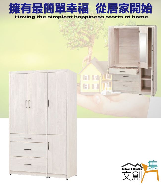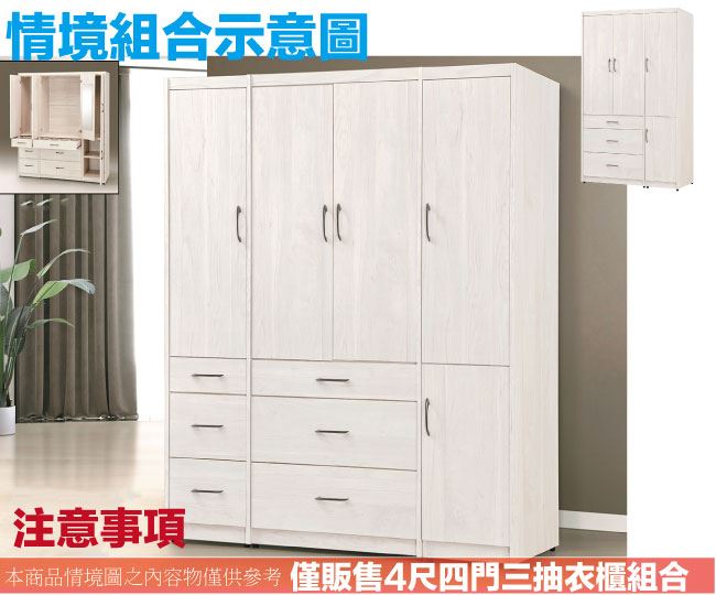 商 品 介 紹 | 【綠家居】凱萊4尺三抽四門衣櫃(門片內設穿衣鏡面) 白梧桐木紋色系+現代簡約風格+安心材質製造,使用放心+搭配居家更便利,整體採用防蛀木心板+五金滑軌結構+防夾手緩衝門片五金+防潮耐磨底座等安心材質製造搭配外層採用優莉坦耐磨全包式噴漆處理 ,採用開門櫃+吊衣桿+三抽屜+門片內設穿衣鏡面+內開放層格等收納空間設計,全由專人配送到家,專業安心服務,替你省下更多時間! 【商品特色】 白梧桐木紋色系+現代簡約風格+安心材質製造,使用放心+搭配居家更便利 防蛀木心板+五金滑軌結構+防潮耐磨底座+防夾手緩衝門片五金等安心材質製造 採用開門櫃+吊衣桿+三抽屜+門片內設穿衣鏡面+內開放層格等收納空間設計 此商品不需要DIY組立,此商品為組立後之成品 品質保證、專業設計、貼心服務 全由專人配送到家,專業安心服務,替您省下更多時間