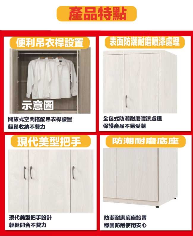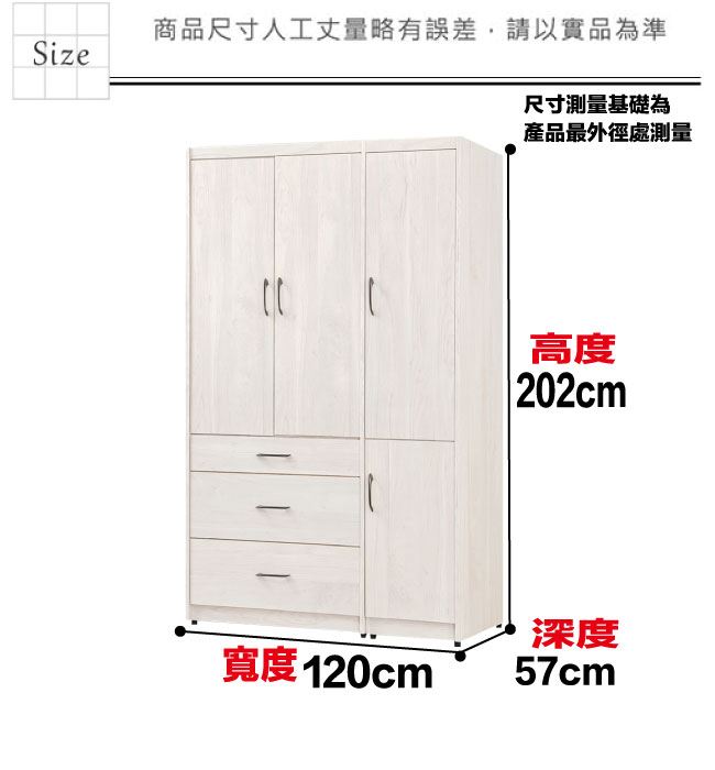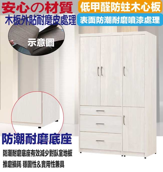 材質 | ◆產品名稱:【綠家居】凱萊4尺三抽四門衣櫃(門片內設穿衣鏡面) 尺寸:(寬)120x(深)57x(高)202/公分 ◆材質: 材質:防蛀木心板+五金滑軌結構+防潮耐磨底座+防夾手緩衝門片五金 噴漆:防潮耐磨噴漆處理 |