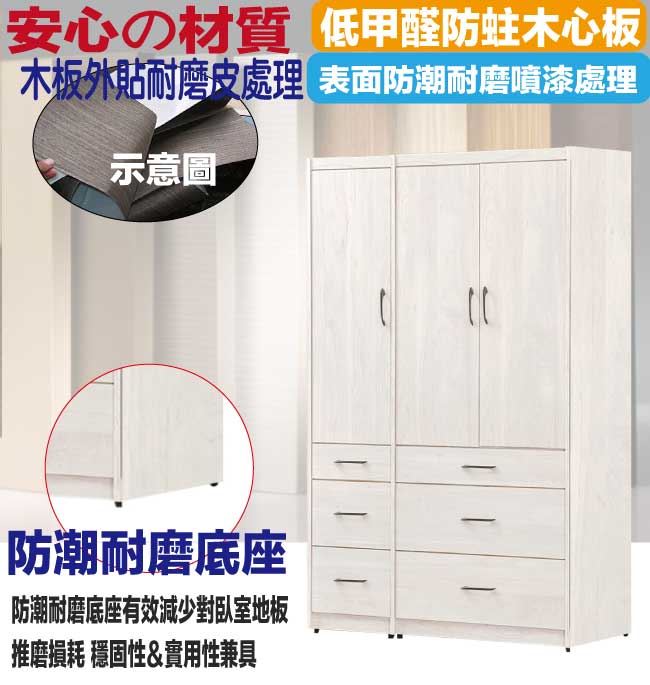 材質 | ◆產品名稱:【綠家居】凱萊4尺三門六抽衣櫃(門片內設穿衣鏡面) 尺寸:(寬)120x(深)57x(高)202/公分 ◆材質: 材質:防蛀木心板+五金滑軌結構+防潮耐磨底座+防夾手緩衝門片五金 噴漆:防潮耐磨噴漆處理 |