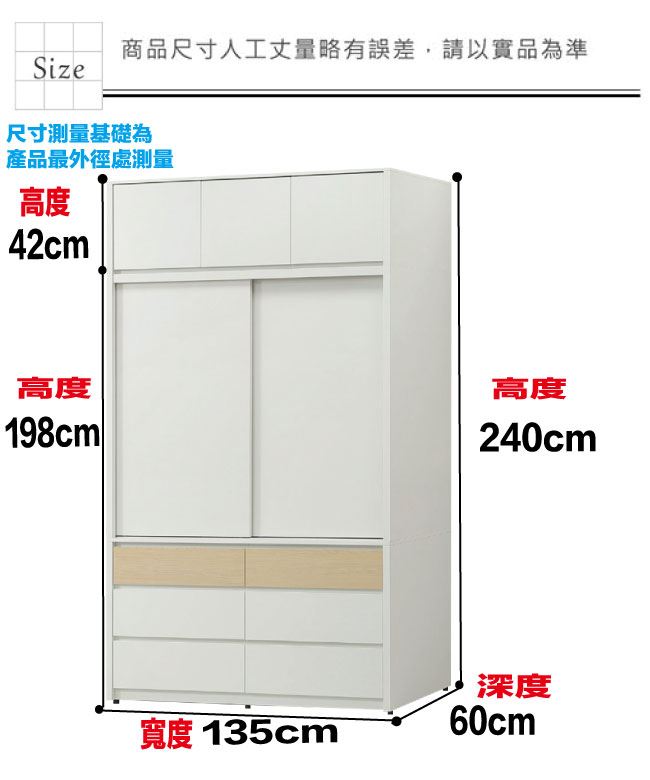 材質 | ◆產品名稱:【綠家居】歐瑞雙色4.5尺開&推門六抽加高衣櫃組合 尺寸:(寬)135x(深)60x(高)240/公分 ◆材質: 材質:防蛀木心板+防潮耐磨底座+防夾手緩衝門片五金+五金滑軌結構+白色面板外層採用皮革紋路特殊處理 噴漆:防潮耐磨噴漆處理 |