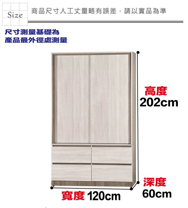 材質 | ◆產品名稱:【綠家居】希卡4尺推門四抽衣櫃 尺寸:(寬)120x(深)60x(高)202/公分 ◆材質: 材質:防蛀木心板+防潮耐磨底座+五金滑軌結構 噴漆:防潮耐磨噴漆處理 |