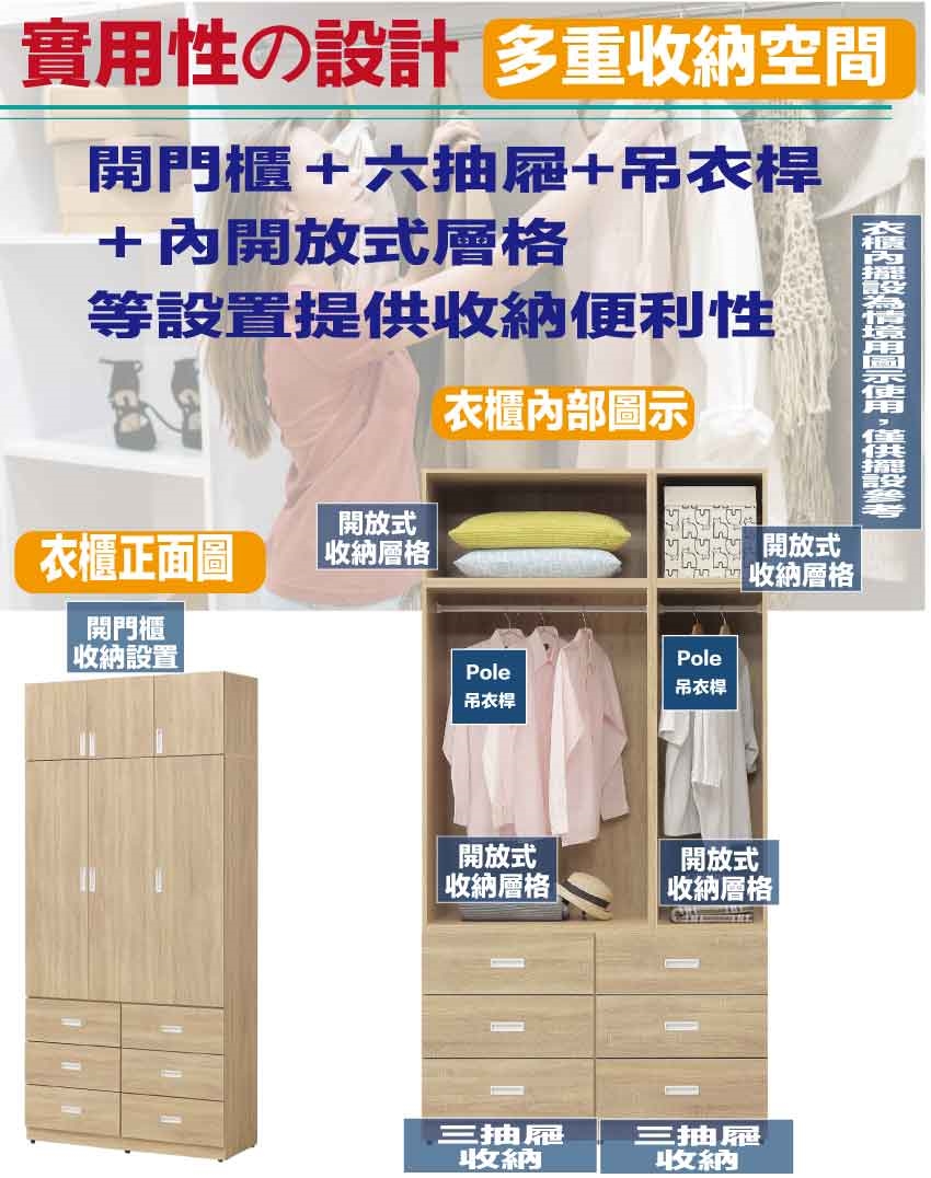 搭配開門櫃+吊衣桿+六抽屜+內開放層格等收納空間設計