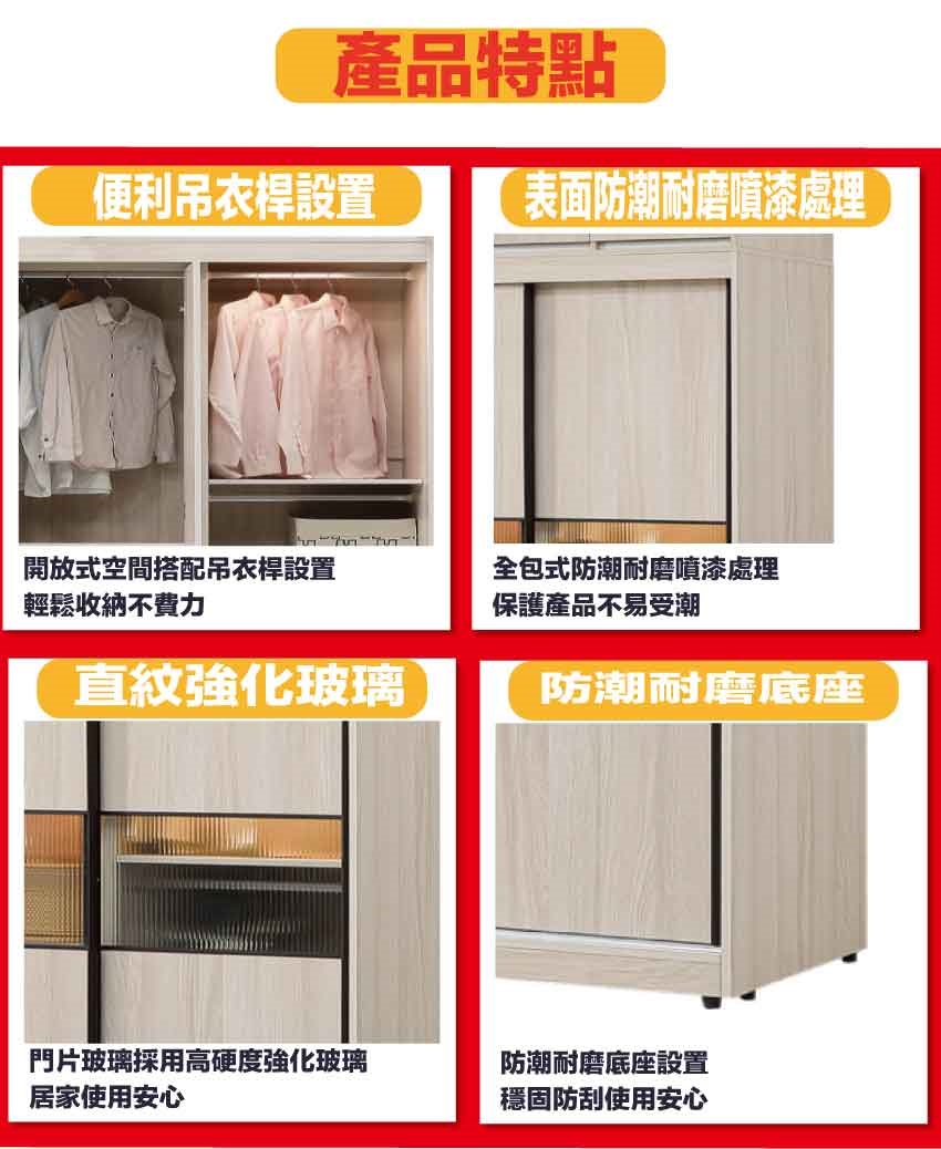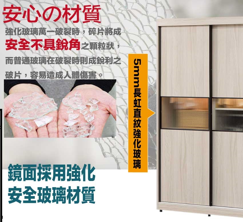 採用防蛀木心板+防潮耐磨底座+防夾手緩衝門片五金+5mm直紋強化玻璃等安心材質製造