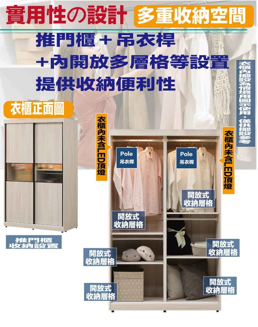 搭配採用推門櫃+吊衣桿+內開放層格等收納空間設計