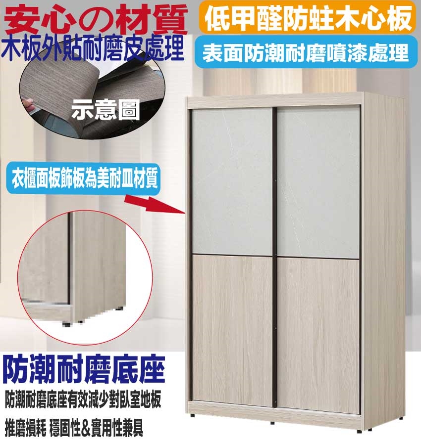 ★偏遠地區需額外加收運費,下標請先問與答詢問★ ★下訂前注意 由於商品流動較快,下訂前請先詢問是否有貨在下訂喔~★ 【綠家居】希望雙色4尺推門衣櫃 木紋雙色系+安心材質製造,使用放心+搭配居家更便利,採用防蛀木心板+防潮耐磨底座+耐磨美耐皿材質門片飾板等安心材質製造 ,外層採用防潮耐磨噴漆處理搭配採用推門櫃+吊衣桿+內開放層格等收納空間設計,全由專人配送到家,專業安心服務,替你省下更多時間!