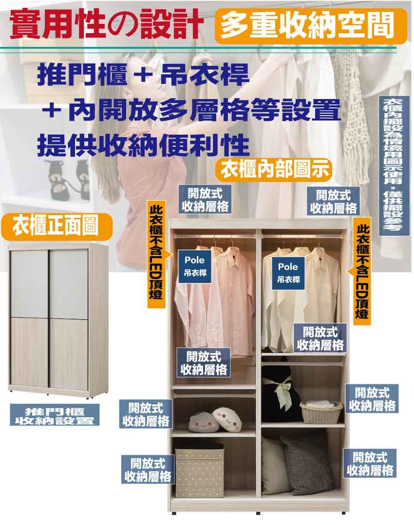 搭配採用推門櫃+吊衣桿+內開放層格等收納空間設計