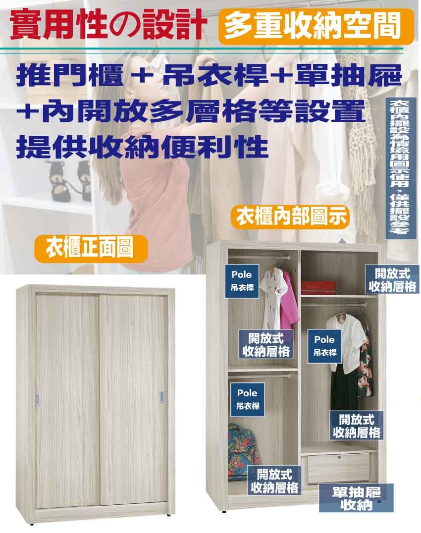 搭配推門櫃+吊衣桿+單抽屜+內開放式層格等收納空間設計