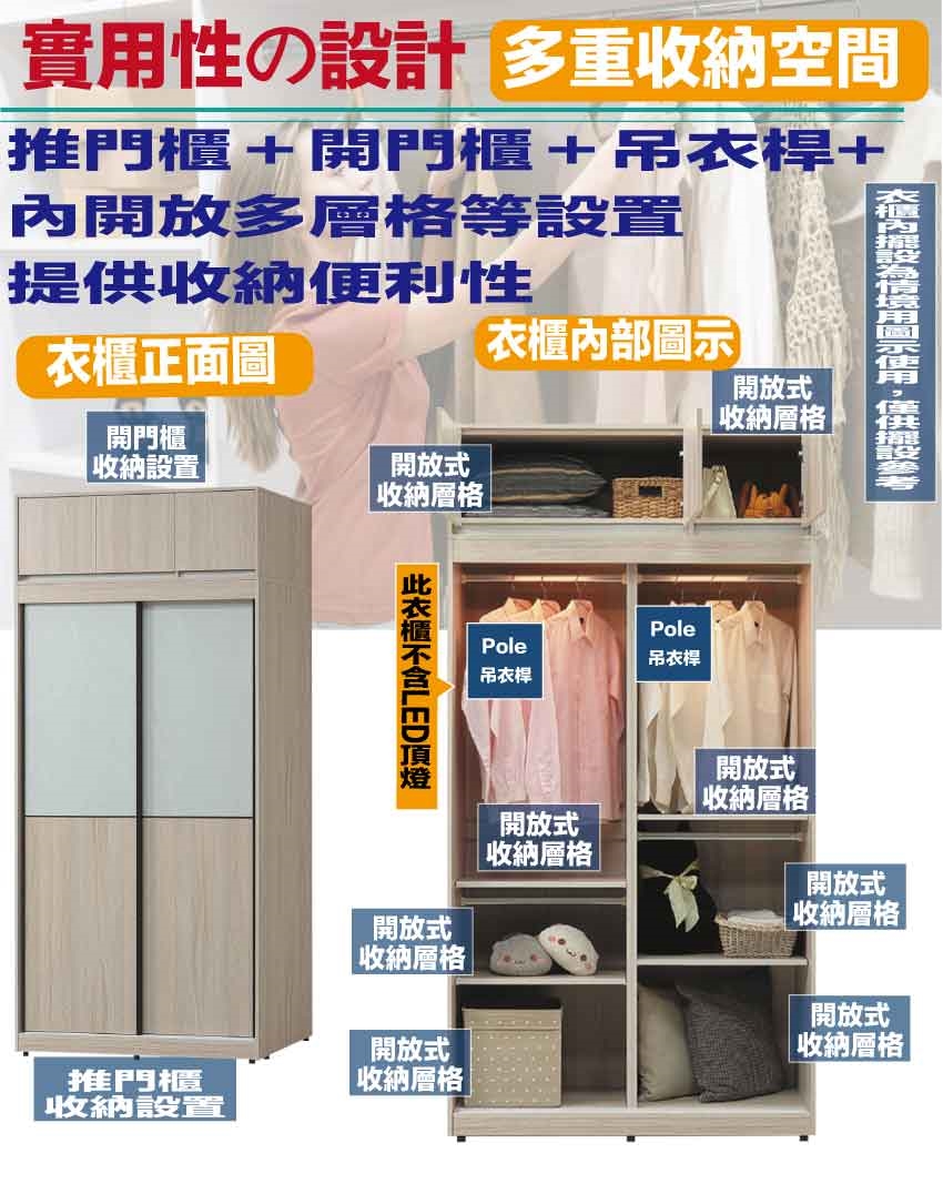 搭配採用開門櫃&推門櫃+吊衣桿+內開放多層格等收納空間設計