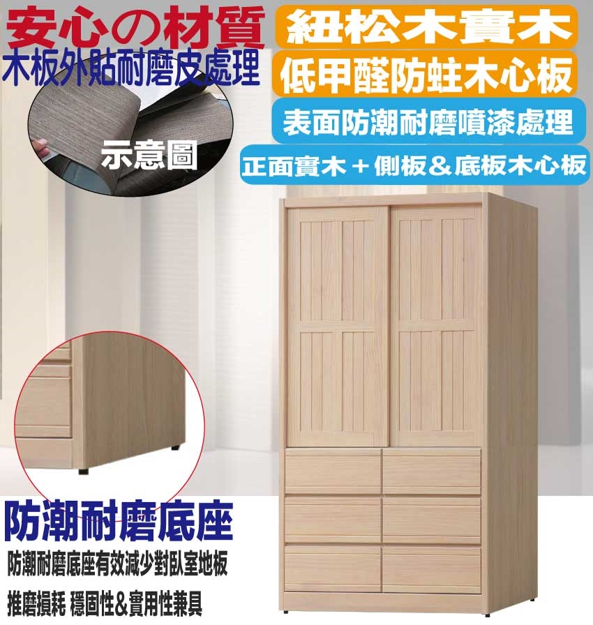 採用紐松木實木+防蛀木心板+防潮耐磨腳座+五金滑軌結構等安心材質製造