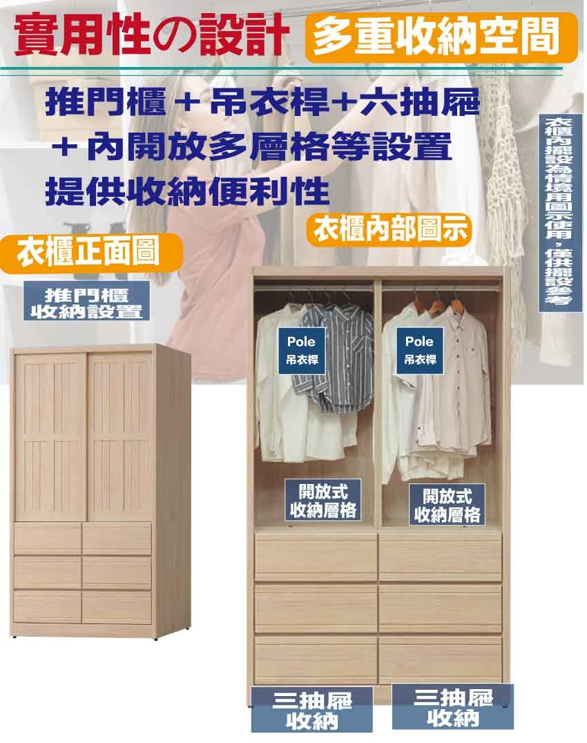 搭配採用推門櫃+吊衣桿+六抽屜+內開放層格等收納空間設計