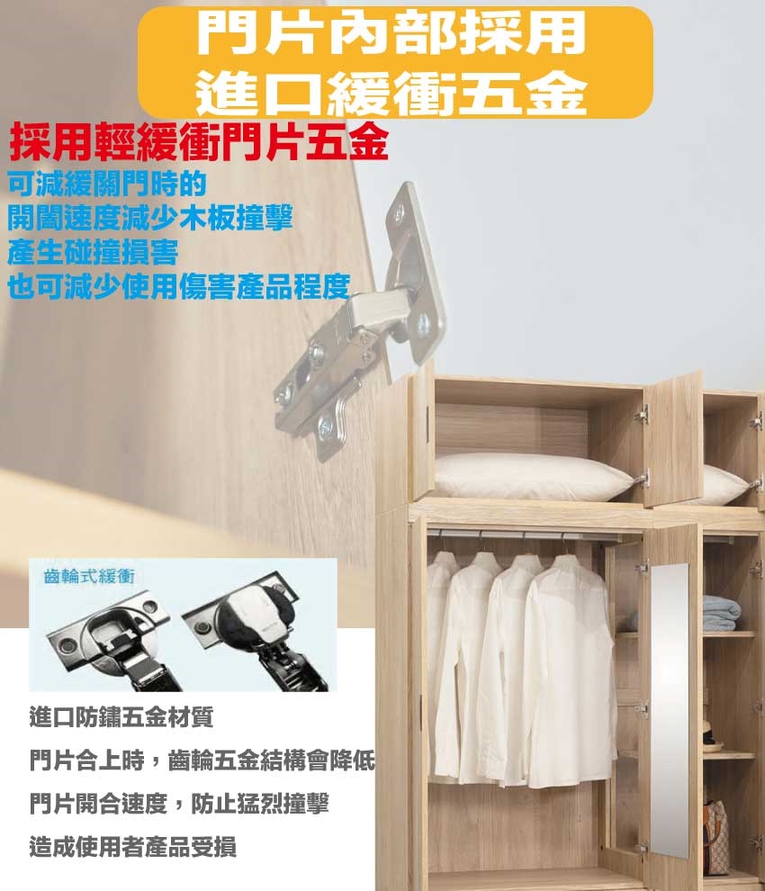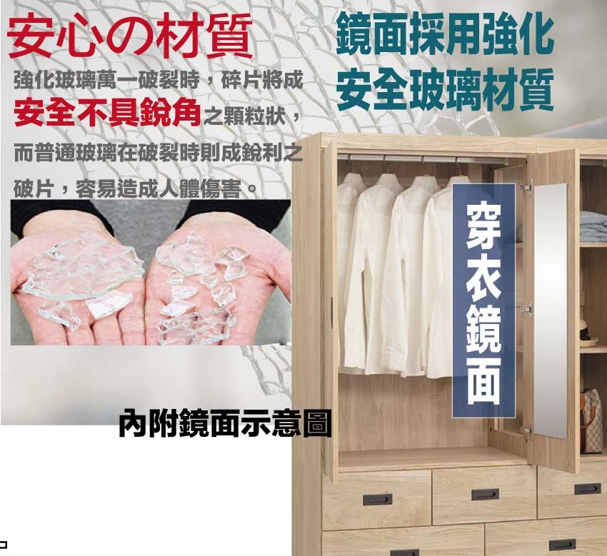 材質:防蛀木心板+五金滑軌結構+防夾手緩衝門片五金+烤漆五金腳座+強化玻璃鏡面