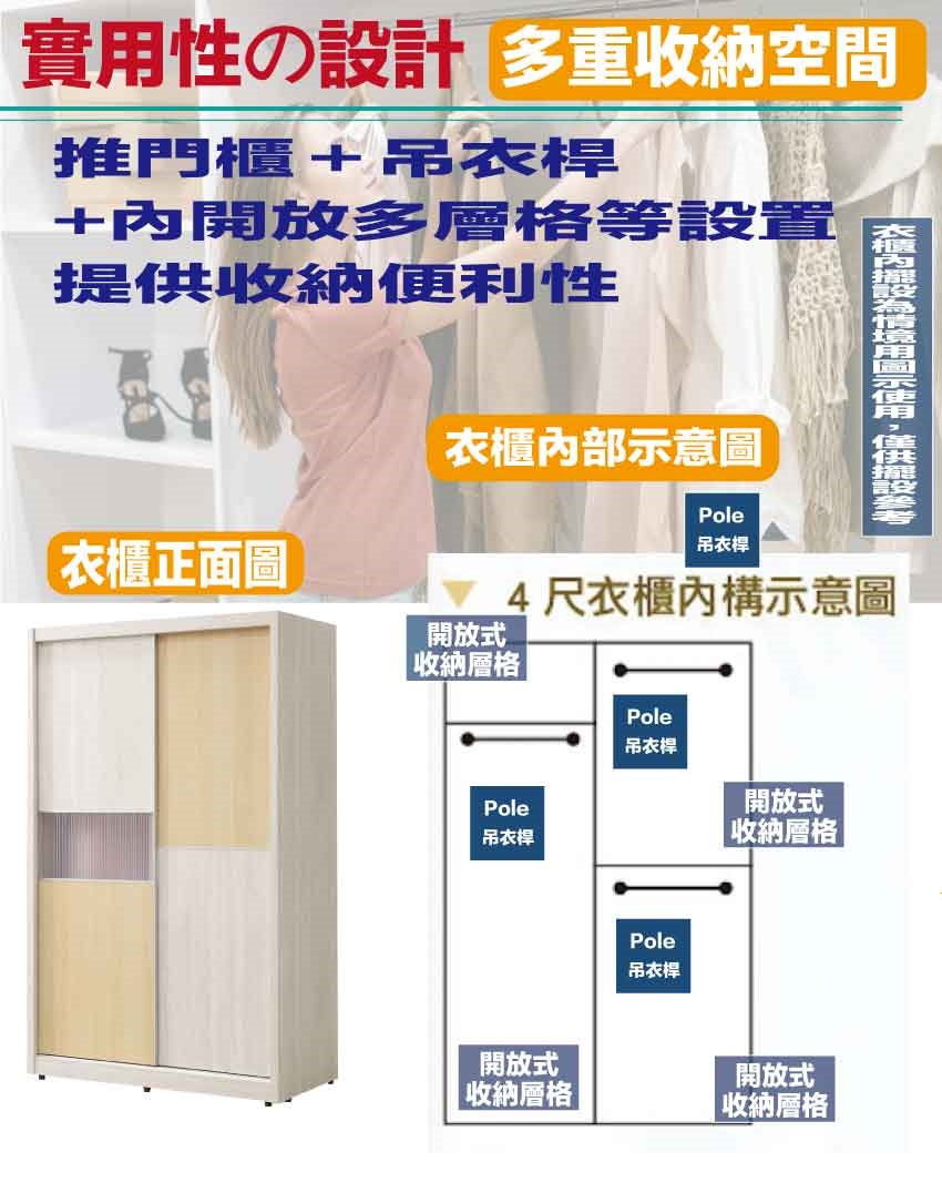 搭配採用推門櫃+吊衣桿+單抽屜+內開放多層格等收納空間設計