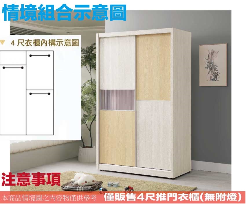 ★偏遠地區需額外加收運費,下標請先問與答詢問★ ★下訂前注意 由於商品流動較快,下訂前請先詢問是否有貨在下訂喔~★ 【綠家居】菲可雙色4尺推門玻璃衣櫃 木紋雙色系+安心材質製造,使用放心+搭配居家更便利,採用防蛀木心板+防潮耐磨底座+五金滑軌結構+強化玻璃門片等安心材質製造 ,外層採用防潮耐磨噴漆處理搭配採用推門櫃+吊衣桿+單抽屜+內開放多層格等收納空間設計,全由專人配送到家,專業安心服務,替你省下更多時間!