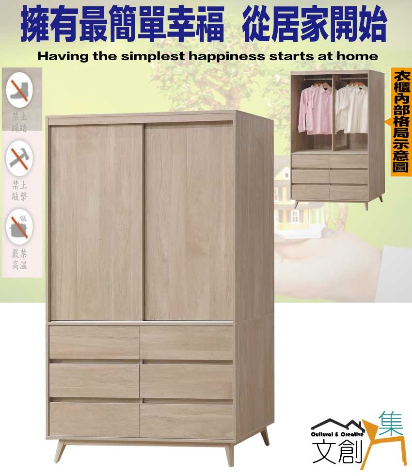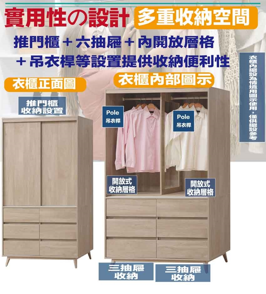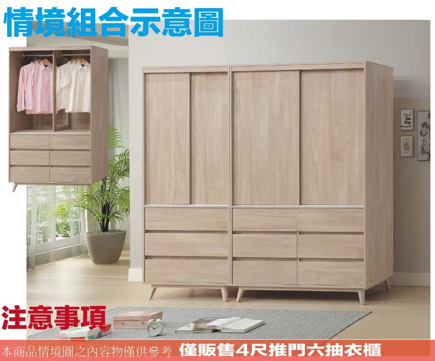 - ◆產品名稱:【綠家居】卡羅4尺推門六抽衣櫃