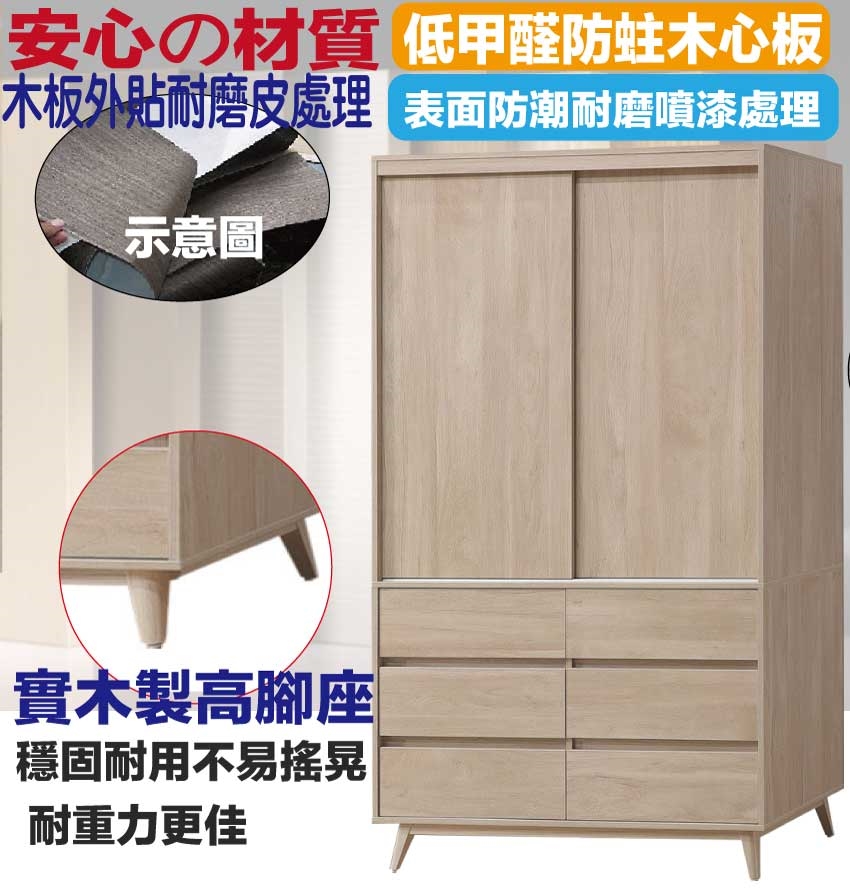 ★偏遠地區需額外加收運費,下標請先問與答詢問★ ★下訂前注意 由於商品流動較快,下訂前請先詢問是否有貨在下訂喔~★ 【綠家居】卡羅4尺推門六抽衣櫃 橡木紋色系+現代簡約風格+安心材質製造,使用放心+搭配居家更便利,整體採用防蛀木心板+實木製高腳座(底置防刮腳粒)等安心材質製造搭配外層採用防潮耐磨噴漆處理 ,採用推門櫃+吊衣桿+六抽屜+內開放層格等收納空間設計,全由專人配送到家,專業安心服務,替你省下更多時間!