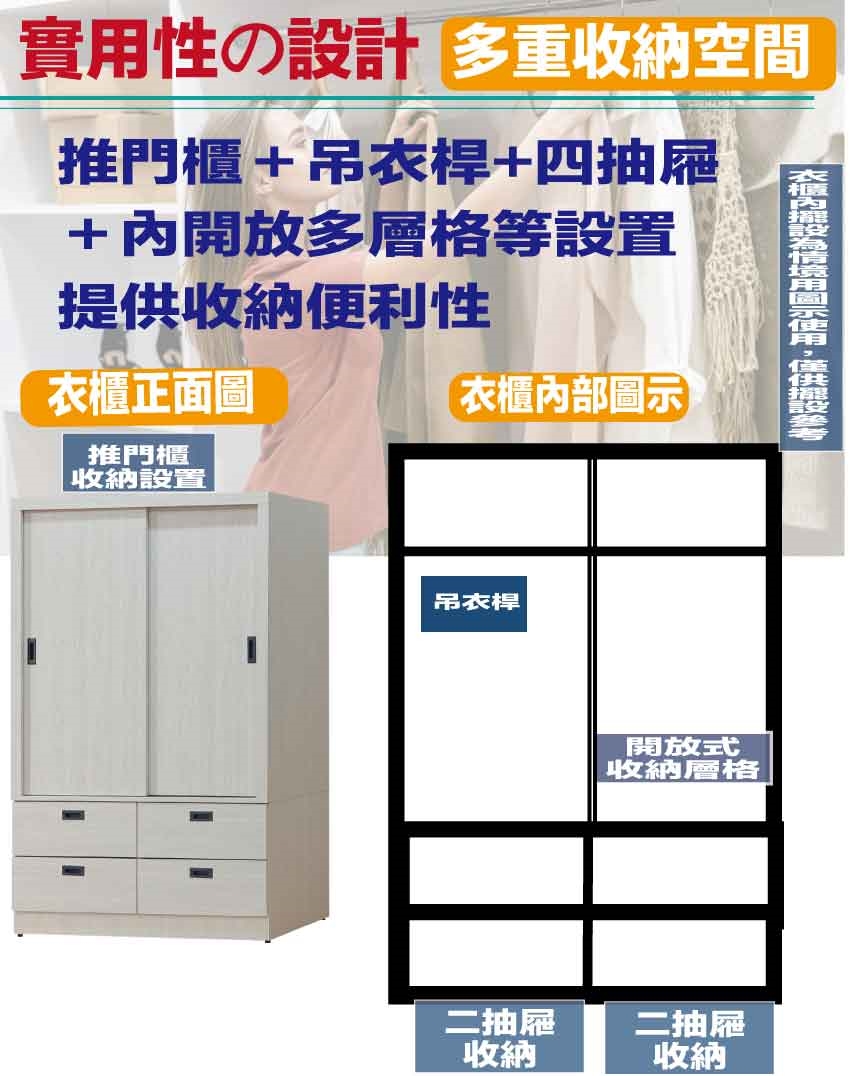推門櫃+吊衣桿+四抽屜