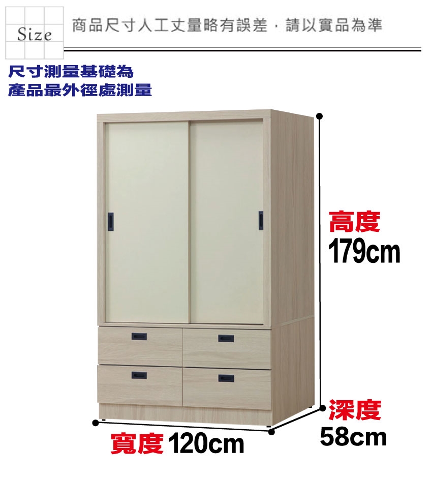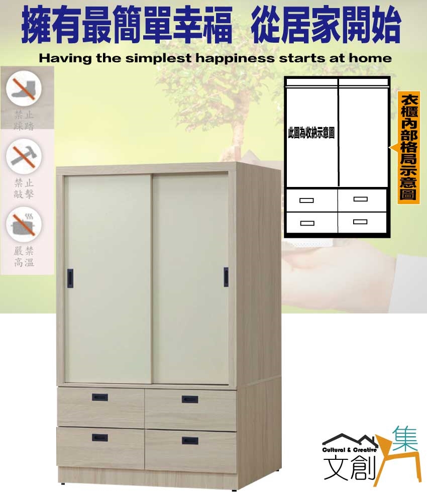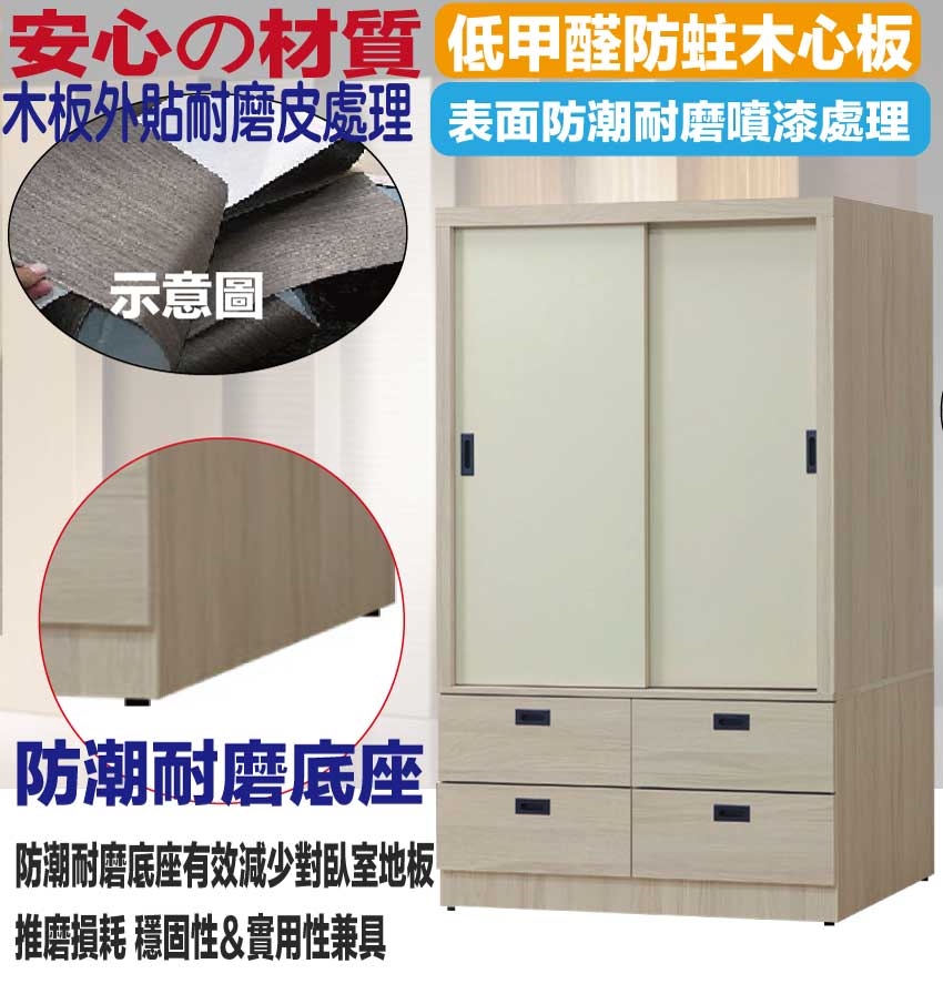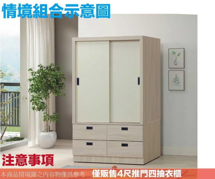 - ◆產品名稱:【綠家居】艾悠4尺推門四抽衣櫃