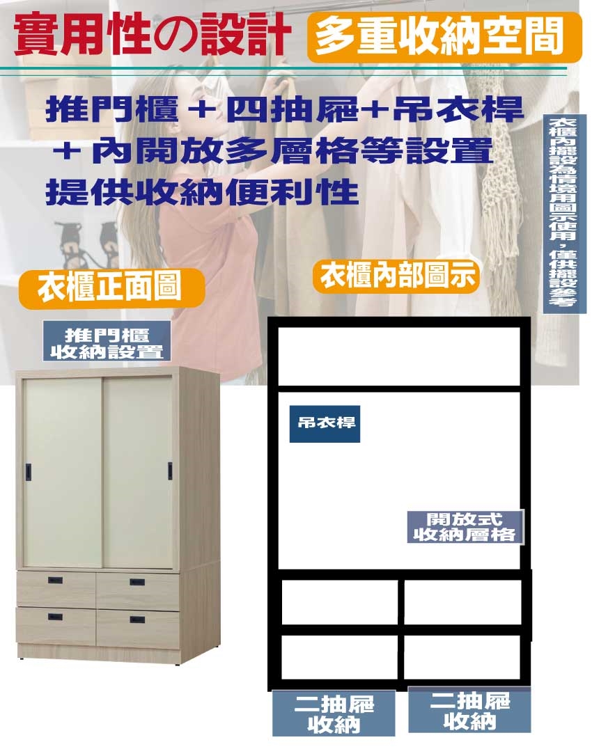 推門櫃+吊衣桿+四抽屜