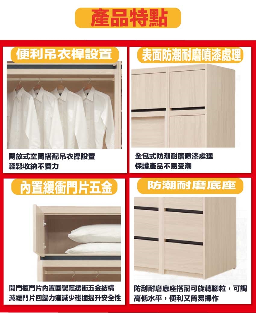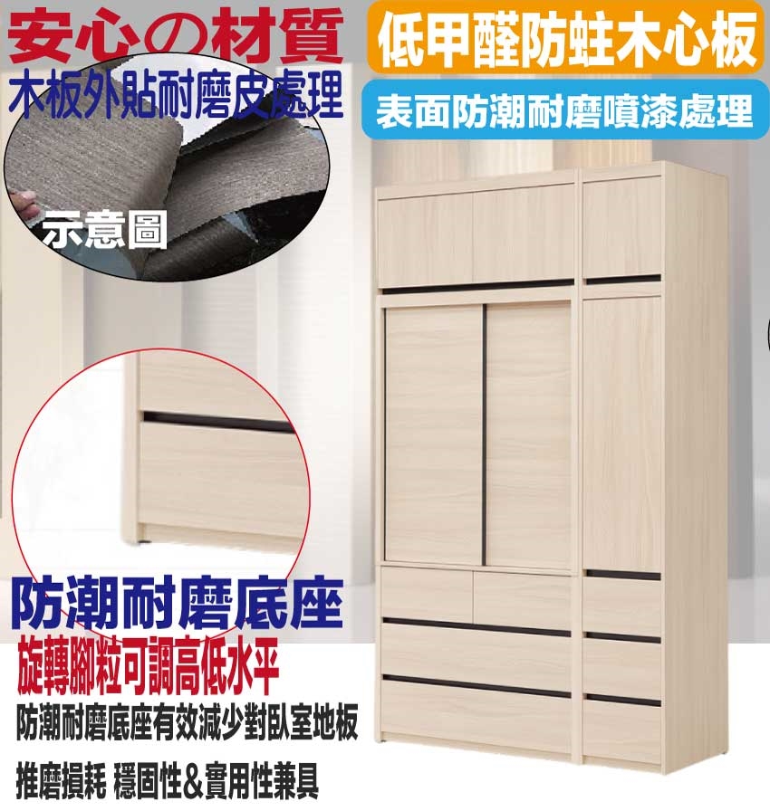 材質:防蛀木心板+防潮耐磨底座(可調高低水平)+防夾手緩衝門片五金