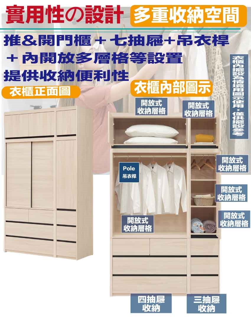 採用開門櫃&推門櫃+吊衣桿+七抽屜+內開放層格等收納空間設計