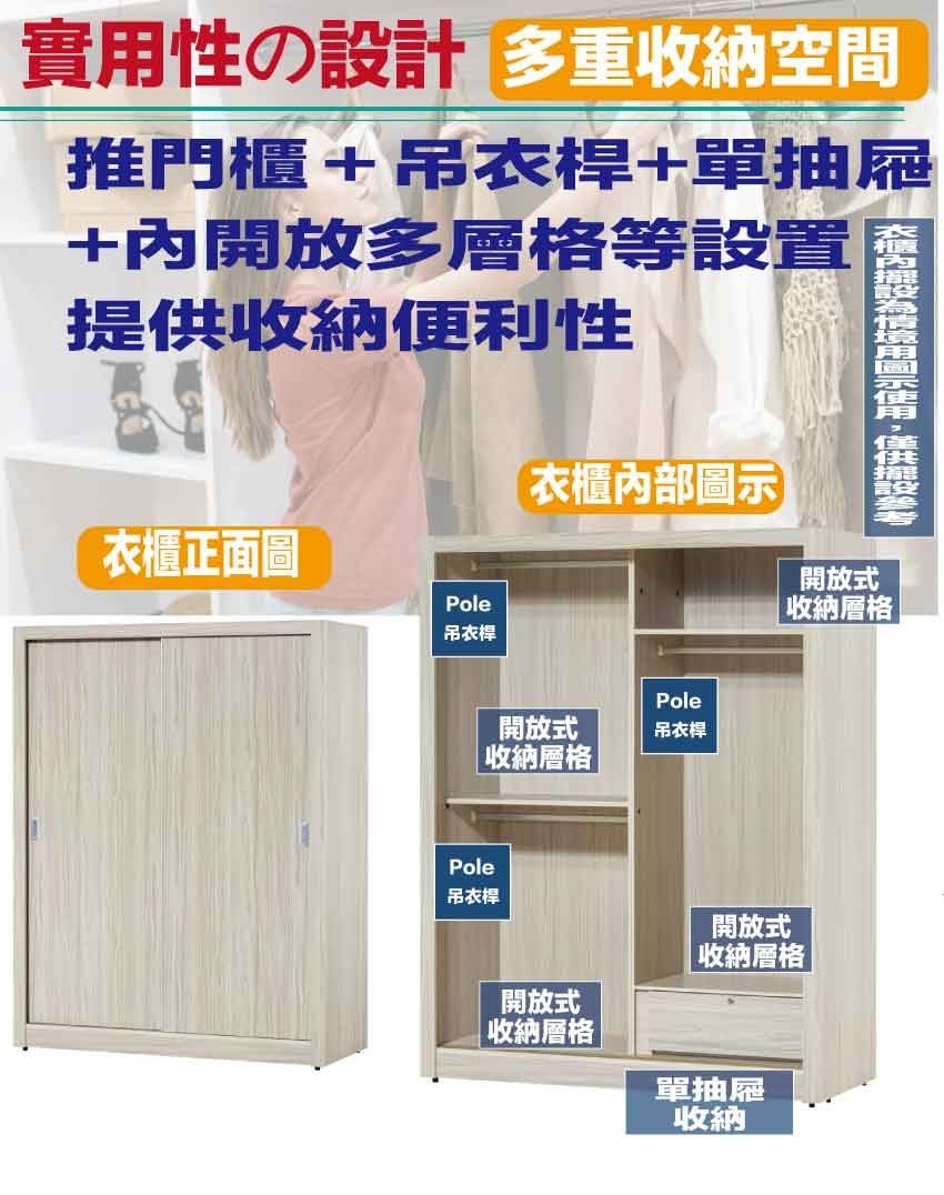 採用推門櫃+吊衣桿+單抽屜+內開放層格等收納空間設計