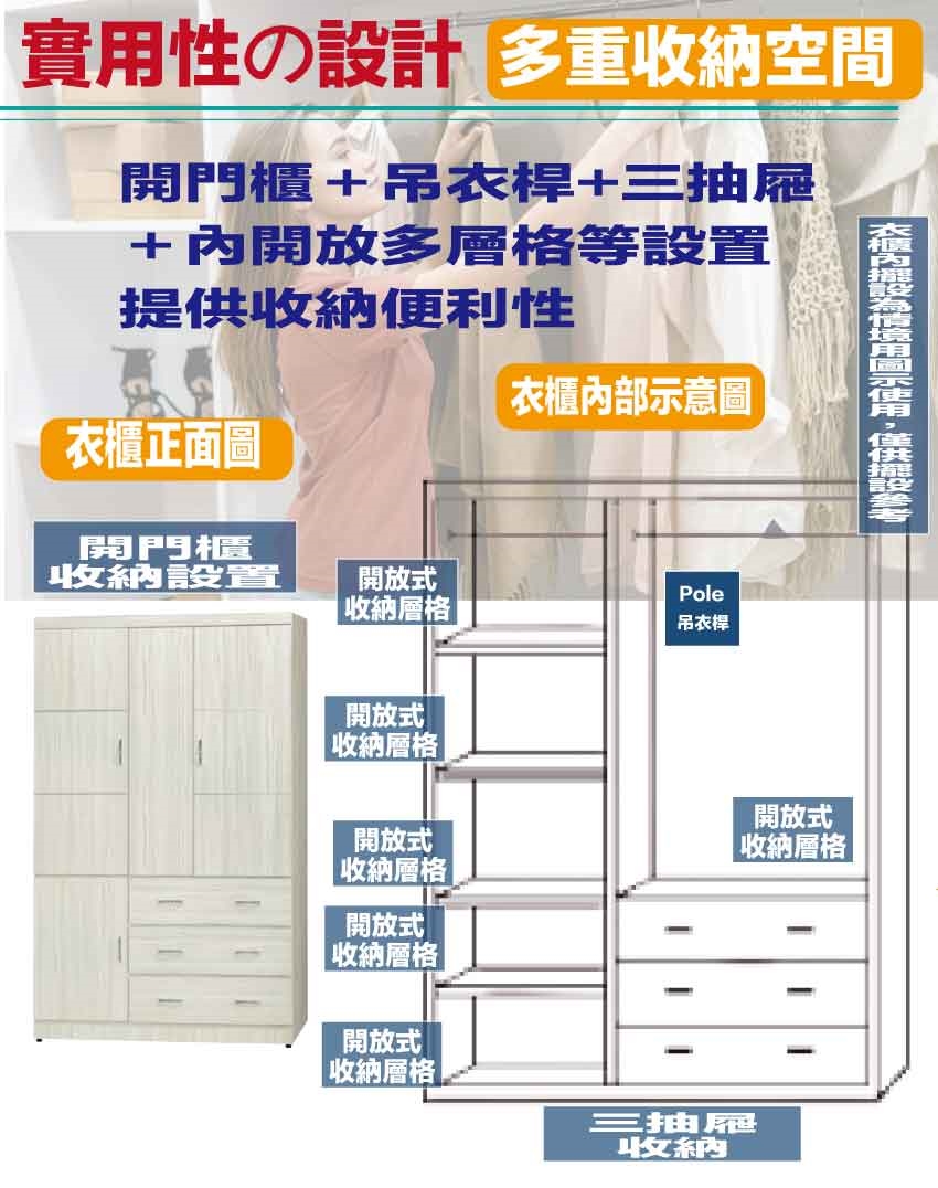搭配採用開門櫃+吊衣桿+三抽屜+內開放層格等收納空間設計