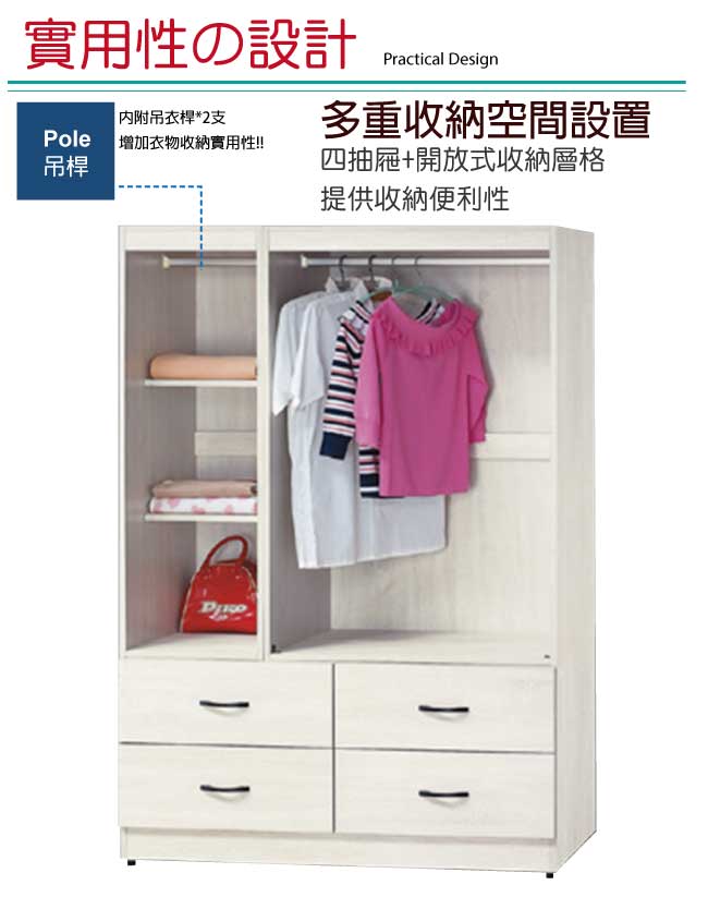四抽屜+開放式層格+吊衣桿等收納設計,讓您保持空間整齊乾淨不再是夢想